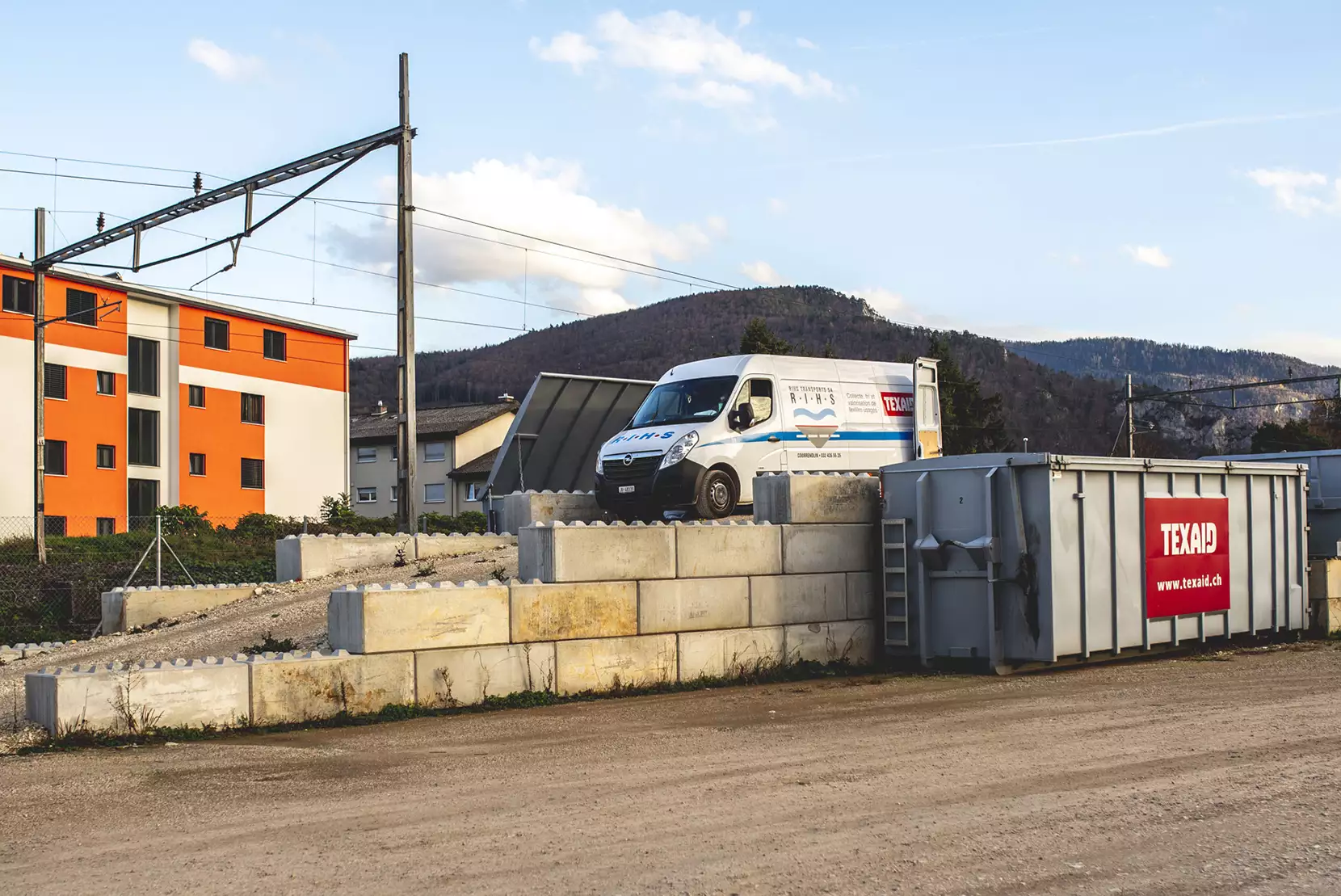 Rihs Transports évacue les boues de garage et de dépotoirs et les traite directement à Courrendlin. Les boues sont lavées dans une installation qui permet de les séparer et de les éliminer ou les revaloriser. Le sable et le gravier est ainsi réutiliser pour créer du béton, tandis que les déchets organiques sont incinérés. L’eau issue de l’installation, une fois traitée, est réutilisée dans un circuit fermé pour l’entretien de notre site.